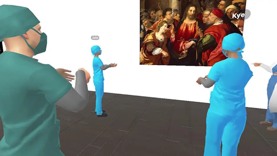 [An interdisciplinary team at the University of Miami is studying the effectiveness of visual arts training via presence-evoking virtual reality for teaching medical, nursing and physical therapy students. As one of the researchers notes, “Through guided discussion of art, students learn to embrace multiple perspectives, tolerate ambiguity, and support their interpretations with evidence, which are abilities that translate directly to the bedside.” See the original version of the story for two more images. For a related story about a virtual reality nutrition training program, see a story from New Mexico State University. –Matthew]