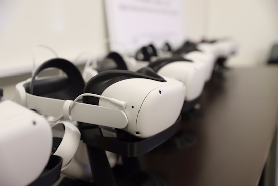 [VR headsets in the college’s Lab for Immersive Technologies and Simulation]